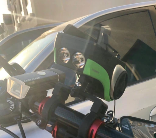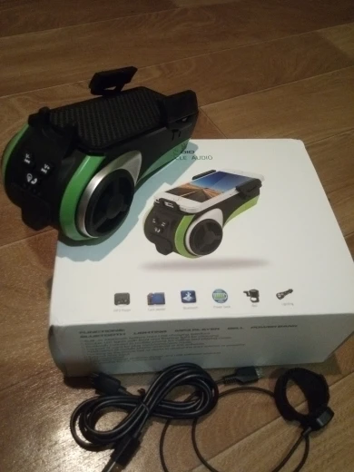 Very handy device. Nice speaker, phone is strong secured. The " bell " is a car horn. Strange but effective. Powerbank, light, bleutooth speaker. This thing has it all...